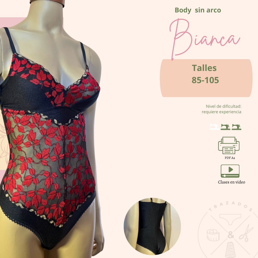El body Bianca es un modelo simple y sentador. Por el frente tazas combinadas de tela y puntilla, con elástico en bajo busto y recortes de puntilla en el cuerpo para aprovechar la onda de las puntilla. Por la espalda un corte en el centro da una cola semi less, ajuste en la cintura para que se pegue al cuerpo y espalda tipo camiseta. Por el interior unas coletas elastizadas favorecen el ajuste de las tazas. Esta es la versión básica de 5 talles, los estándar, que abarcan hasta 105 de busto y hasta 115 de cadera.