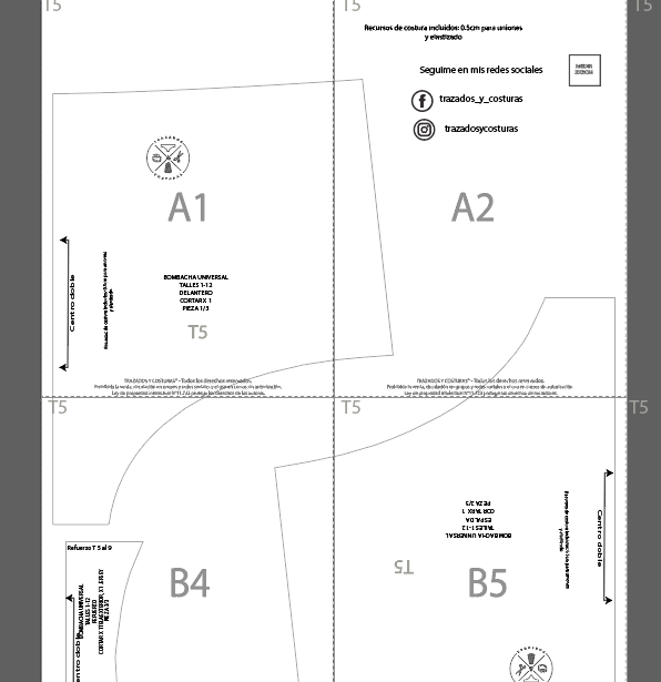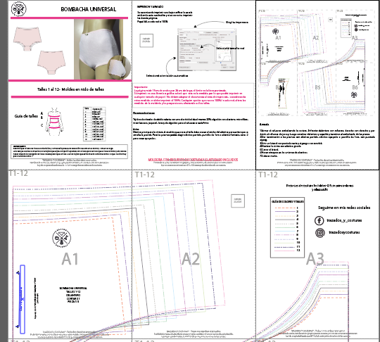 Cada modelo tiene 2 archivos, uno con los moldes en nido para calcar y otro con cada talle separado. Ambos archivos incluyen recursos de costura, tabla de talles, textiles sugeridos, guía de impresión y armado en texto.