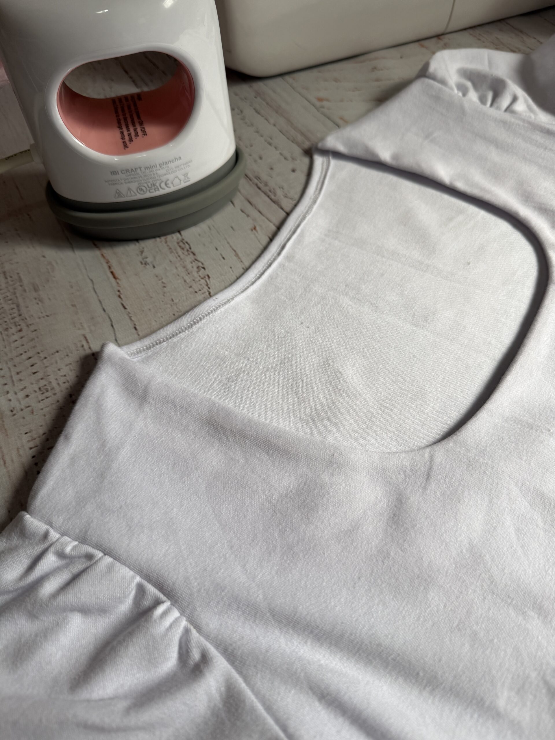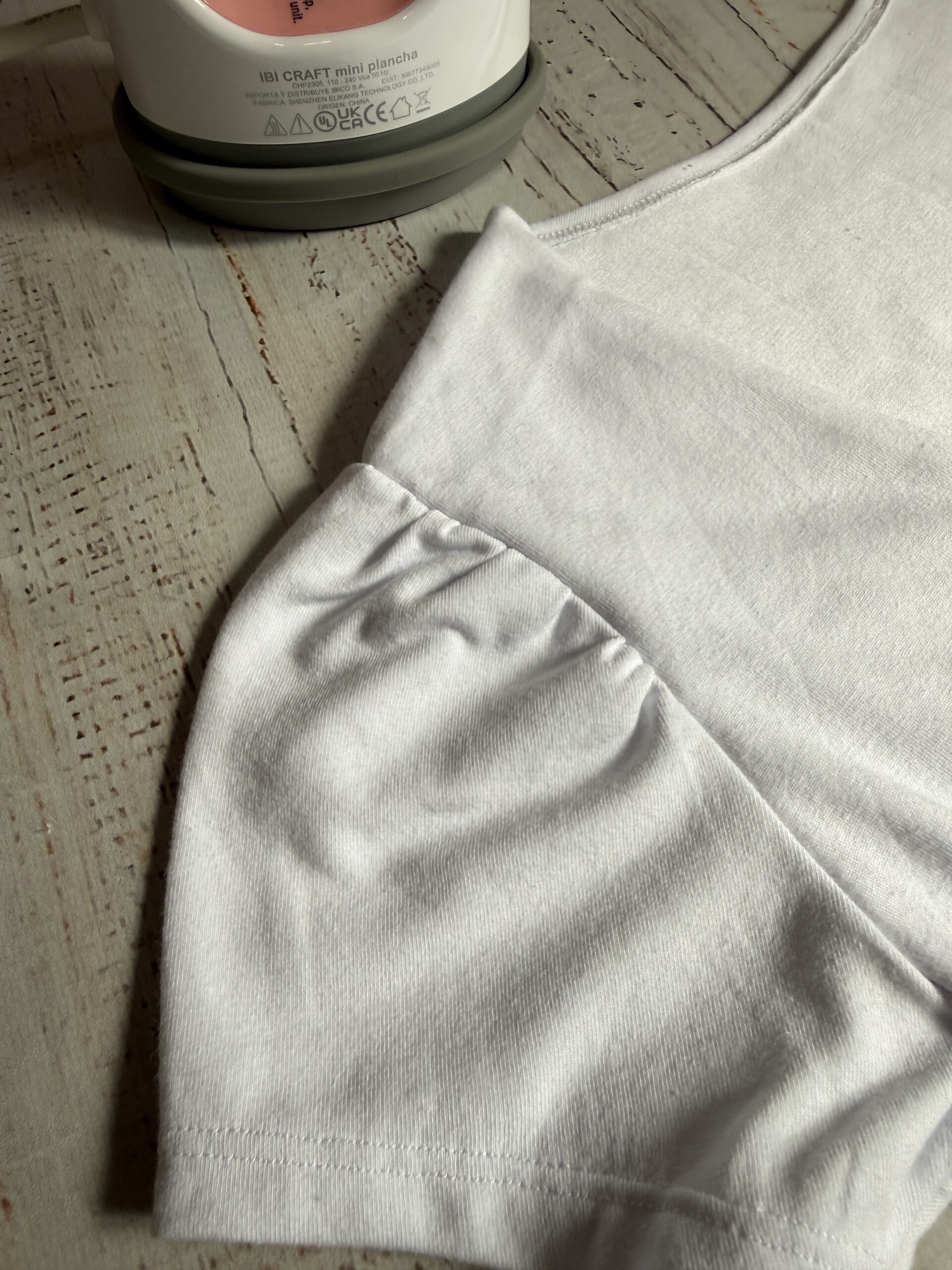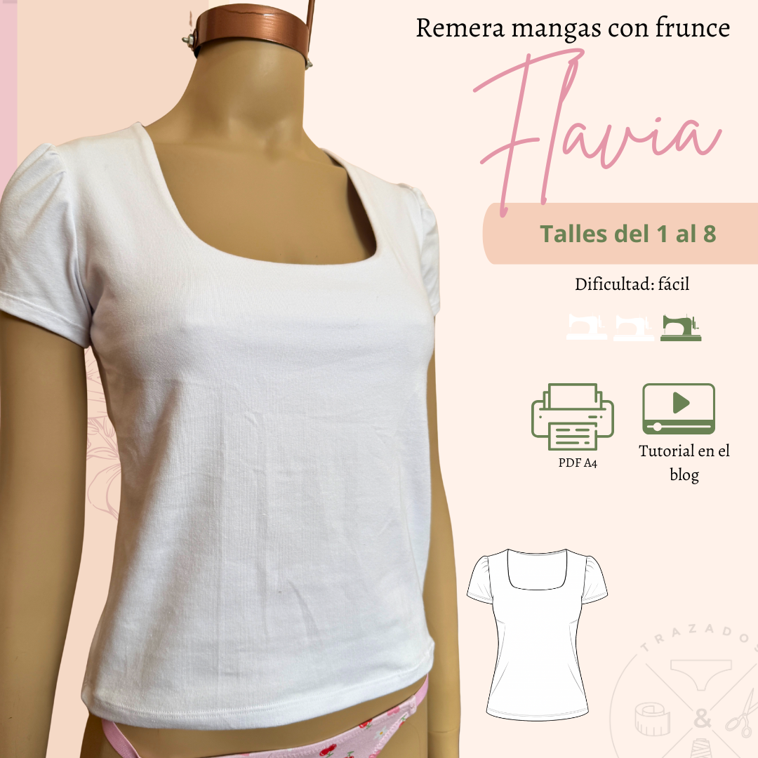 Moldería de remera mangas cortas con frunce y escote cuadrado, para tejido de punto elastizado. 8 talles, del 1 al 8.